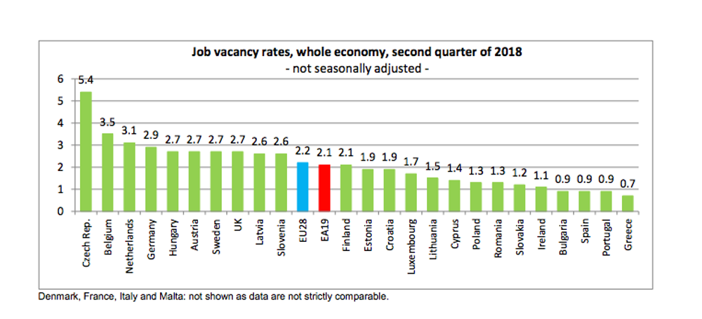 Αξίζει να σημειωθεί ότι ακόμη και σε οικονομίες με υψηλότερους δείκτες απασχόλησης, όπως Γερμανία, Ολλανδία και Βέλγιο, το ποσοστό διαθέσιμων θέσεων αγγίζει ή υπερβαίνει κατ’ ελάχιστον το 3%. Στην κορυφή της λίστας της Eurostat με το μεγαλύτερο ποσοστό διαθέσιμων θέσεων τοποθετείται η Τσεχία.