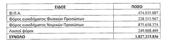 Σε ό,τι αφορά τις οφειλές του Δημοσίου προς τους ιδιώτες αυτές ανέρχονται σε 1,8 δισεκατομμύρια ευρώ. Συγκεκριμένα, από το σύνολο του 1.827.215.836 ευρώ, το Δημόσιο οφείλει σε επιστροφές φόρου εισοδήματος νομικών προσώπων 875 εκατομμύρια, σε φυσικά πρόσωπα 228 εκατομμύρια και σε επιστροφές ΦΠΑ 474 εκατομμύρια.