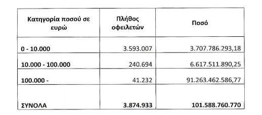 Συγκεκριμένα, 3,6 εκατομμύρια Έλληνες χρωστούν μέχρι 10.000 ευρώ (συνολικά 3,7 δισ), 240.000 Ελληνες οφείλουν από 10.000-100.000 ενώ οι μεγαλοοφειλέτες μπορεί να είναι μόλις 41.232, ωστόσο, χρωστούν πάνω από 91 δισεκατομμύρια ευρώ στο Ελληνικό Δημόσιο.