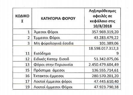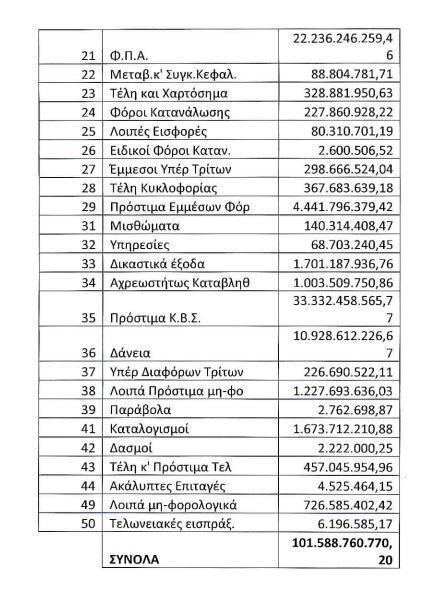 Από τις ληξιπρόθεσμες οφειλές το ποσό για χρωστούμενο ΦΠΑ ξεπερνά τα 22 δισ. ευρώ, το αντίστοιχο για τον φόρο εισοδήματος ανέρχεται σε 18,5 δισ. ενώ οι ληξιπρόθεσμες οφειλές σε δάνεια ανέρχονται σε 10,9 δισ. ευρώ.