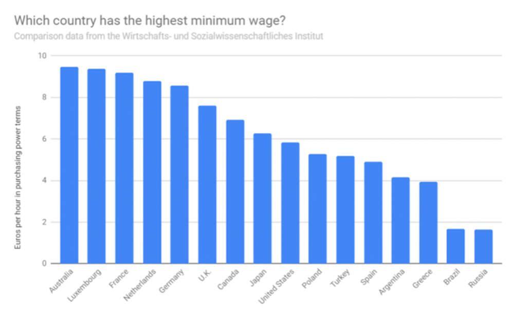 Όπως αναφέρει το Παγκόσμιο Οικονομικό Φόρουμ, το ωρομίσθιο στην Αυστραλία, η οποία βρίσκεται στην κορυφή, ισοδυναμεί με 9,47 ευρώ αγοραστικής δύναμης, όντας εξαπλάσιο της Ρωσίας που αξίζει μόλις 1,64 ευρώ.