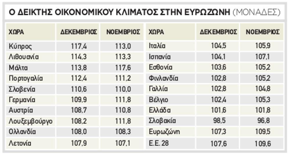 Σχετικά με την Ελλάδα, ο δείκτης σημείωσε μικρή πτώση τον Δεκέμβριο στις 101,6 ομάδες από τις 101,8 που ήταν τον Νοέμβριο. Στους επιμέρους τομείς βελτίωση του κλίματος σημειώθηκε στους κλάδους των υπηρεσιών και του λιανικού εμπορίου, ενώ σημαντική επιδείνωση καταγράφηκε στις κατασκευές.
