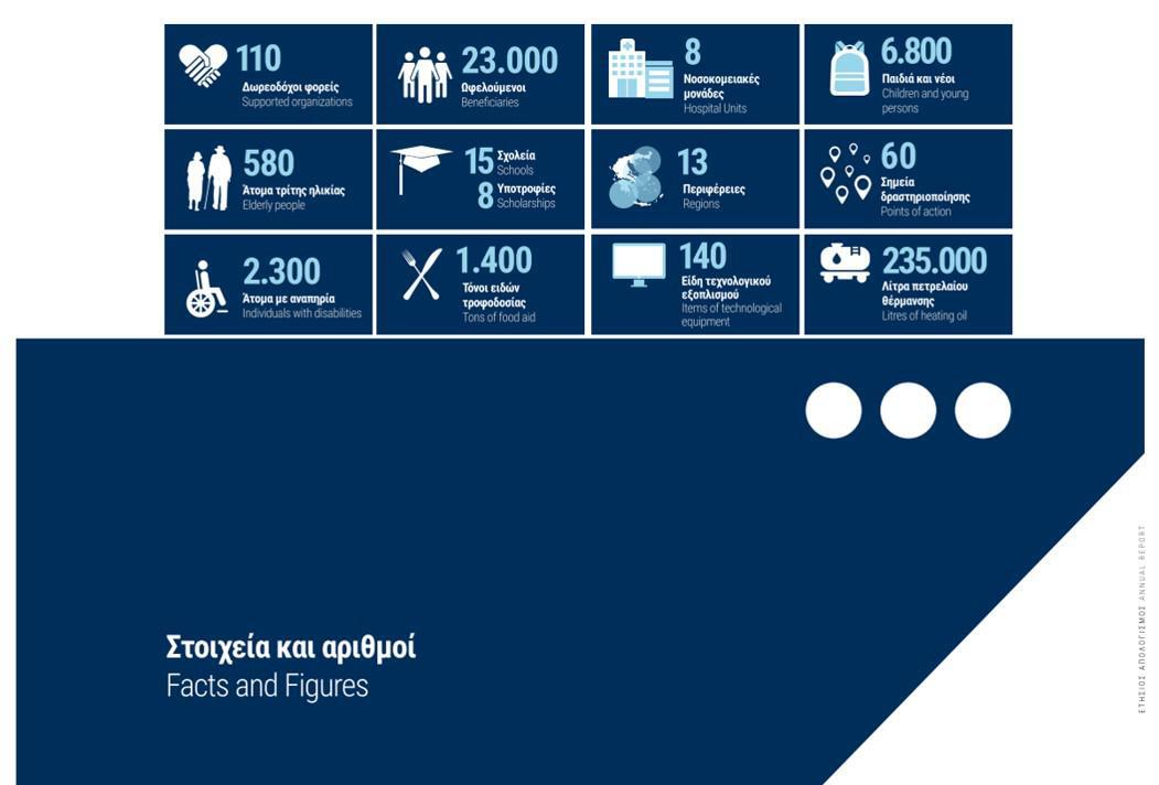 Στο ετήσιο απολογισμό παρουσιάστηκε το μέγεθος της προσφοράς. Το πρόγραμμα «Συμπράττουμε για την Υγεία», με τη συγχρηματοδότηση του Ιδρύματος Λάτση, εστίασε στην κάλυψη επιτακτικών αναγκών και εξοπλισμού φορέων από τον χώρο της Δημόσιας Υγείας. Στον τομέα της Παιδείας, αναπτύχθηκαν προγράμματα χορήγησης υποτροφιών για μεταπτυχιακές σπουδές σε 8 αριστούχους φοιτητές, καθώς και αναβάθμισης του εξοπλισμού δημόσιων σχολείων, στηρίζοντας μαθητές σε όλη τη χώρα.