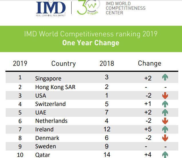 Παγκοσμίως, η Σιγκαπούρη… κλέβει φέτος την παράσταση, αφού ανέβηκε στην πρώτη θέση της λίστας για το 2019, σημειώνοντας άνοδο δύο θέσεων σε σχέση με το 2018. Αντίθετα, οι Ηνωμένες Πολιτείες Αμερικής (ΗΠΑ) χάνουν την πρωτοκαθεδρία στο διεθνές τοπίο ανταγωνιστικότητας και από την πρώτη θέση της κατάταξης βρίσκονται πλέον στην τρίτη. Τη δεύτερη θέση διατηρεί για δεύτερη συνεχόμενη χρονιά το Χονγκ-Κονγκ (σ.σ. η Παγκόσμια Επετηρίδα Ανταγωνιστικότητας του IMD υπολογίζει τη συγκεκριμένη περιφέρεια της Κίνας ως διακριτή οικονομία από την υπόλοιπη χώρα).