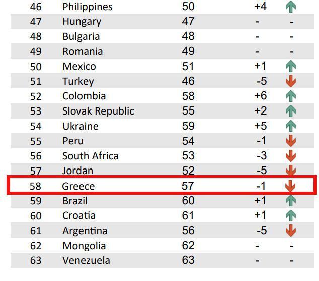 Σημειώνει μάλιστα τη δεύτερη χειρότερη επίδοση στην Ευρωπαϊκή Ένωση μετά την Κροατία (που είναι εξηκοστή), τη στιγμή που η Βουλγαρία και η Ρουμανία κατατάσσονται αντίστοιχα στην 48η και 49η θέση!