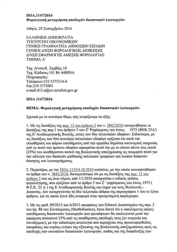 Όπως γίνεται γνωστό από την ΠΟΛ, σε διάφορες υπηρεσίες του Υπ. Οικονομικών κατατέθηκαν πολλαπλά αιτήματα δικαστικών λειτουργών οι οποίοι αιτούνται οι αποδοχές και οι συντάξεις τους να τύχουν της ίδιας φορολογικής μεταχείρισης με αυτούς που προσέφυγαν στο Μισθοδικείο και δικαιώθηκαν.