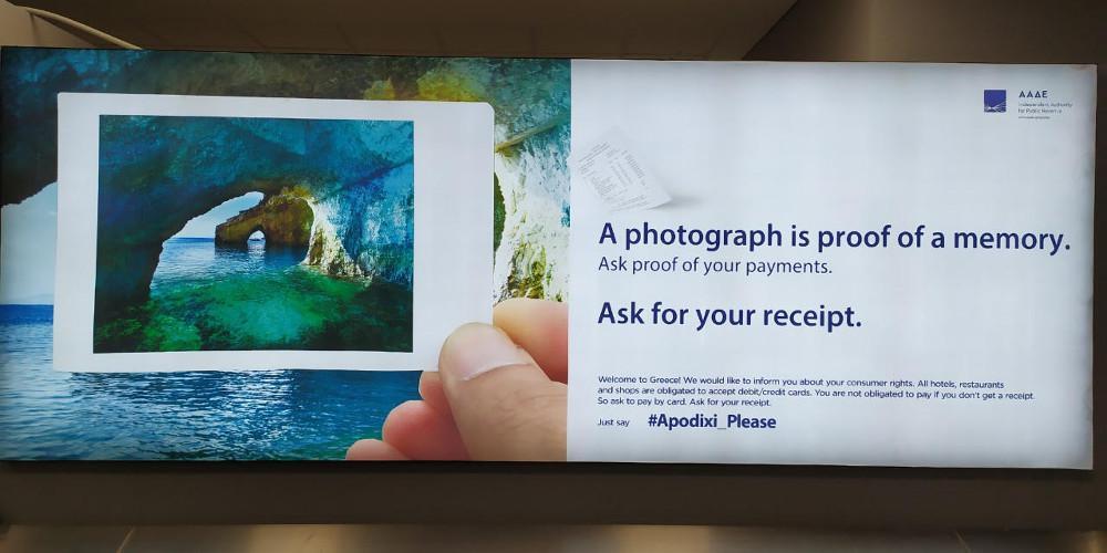 Με μια φωτογραφία από χαρακτηριστικό ελληνικό τοπίο και μια απόδειξη ταμειακής μηχανής δίπλα σε αυτό, αναφέρονται τα εξής στα αγγλικά: