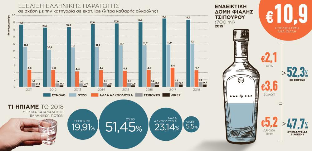 Σύμφωνα με τον κ. Καλογιάννη, η αγορά του τσίπουρου το 2018 αυξήθηκε κατά 4,3% σε σχέση με το 2017 καταγράφοντας τα τελευταία χρόνια μικρή μεν, αλλά σταθερή αύξηση. Οπως δείχνουν στοιχεία του Γενικού Χημείου του Κράτους που επεξεργάστηκε ο ΣΕΑΟΠ, η παραγωγή τσίπουρου ανήλθε πέρυσι στο 1,346 εκατ. άνυδρα λίτρα όταν πέντε χρόνια πριν και συγκεκριμένα το 2015 είχε περιοριστεί στις 973.862 λίτρα.