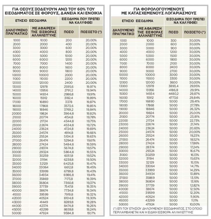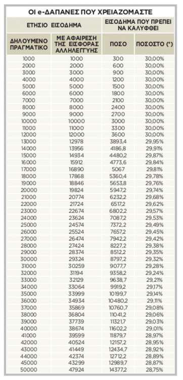 Οι πίνακες που παρουσιάζουμε καλύπτουν ακόμη και τις περιπτώσεις των φορολογουμένων που δικαιούνται να καλύψουν ποσοστά επί των εισοδημάτων τους πολύ μικρότερα του 30%, όπως π.χ. αυτούς που υποχρεούνται κάθε χρόνο να πληρώνουν σε φόρους εισοδήματος, ΕΝΦΙΑ, δόσεις δανείων και ενοίκια κατοικιών, ποσά που υπερβαίνουν αθροιστικά το 60% των ετήσιων εισοδημάτων τους καθώς και αυτούς των οποίων οι τραπεζικοί λογαριασμοί έχουν κατασχεθεί. Ειδικά για τους τελευταίους η πρόβλεψη για ανώτατο όριο 5.000 ευρώ στο ποσό των δαπανών που πρέπει να καλύψουν έχει ως συνέπεια το ποσοστό του ετήσιου πραγματικού εισοδήματος που θα χρειαστεί να καλυφθεί με e-δαπάνες να πέφτει ακόμη και στο 1% για το πολύ υψηλά εισοδήματα!