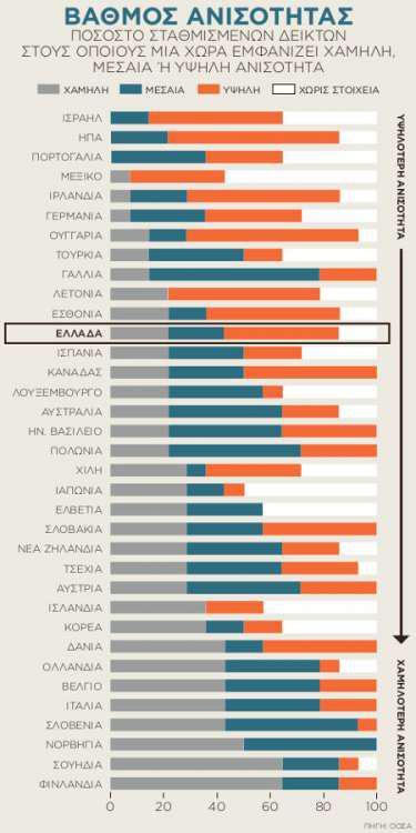 Μεταξύ άλλων, επισημαίνεται πως το μέσο διαθέσιμο εισόδημα του υψηλότερου 20% στη χώρα μας είναι 5,5 φορές μεγαλύτερο από του χαμηλότερου 20% (ενώ στον ΟΟΣΑ 5,4 φορές, στις ΗΠΑ 8,5 φορές και τη Σουηδία 4,1 φορές) και το πλουσιότερο 10% του πληθυσμού κατέχει το 42% του καθαρού πλούτου (έναντι 52% στον ΟΟΣΑ και 78% στις ΗΠΑ), με το υψηλό ποσοστό ιδιοκατοίκησης στην Ελλάδα να συμβάλλει ενδεχομένως στην άμβλυνση των ανισοτήτων πλούτου.