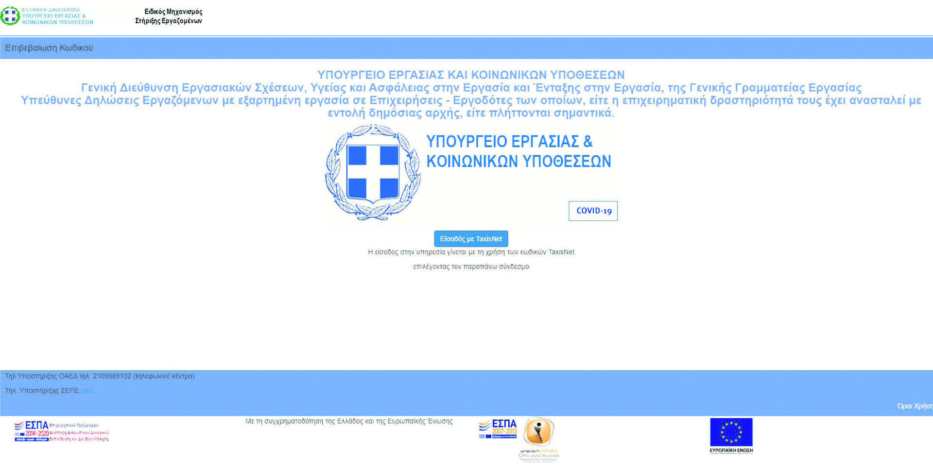 Βήμα 1ο: Από τον υπολογιστή τους πληκτρολογούν τη διεύθυνση https://supportemployees.yeka.gr για να εισέλθουν στην ηλεκτρονική υπηρεσία του μηχανισμού εφαρμογής των μέτρων στήριξης των εργαζομένων με εξαρτημένη εργασία για την αντιμετώπιση των επιπτώσεων του κορονοϊού COVID-19.