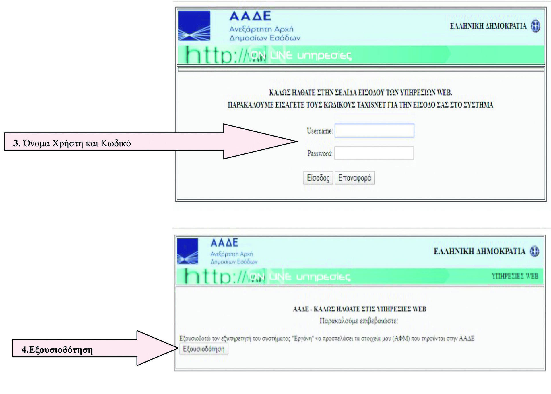 Βήμα 4ο: Ο εργαζόμενος καταχωρεί τους κωδικούς ΤAXISnet (Username και Password) και στη συνέχεια εισέρχεται στις υπηρεσίες WEB της Ανεξάρτητης Αρχής Δημοσίων Εσόδων (ΑΑΔΕ). Εδώ απαιτείται επιβεβαίωση κωδικών με την επιλογή «Εξουσιοδότηση» για τη συγκατάθεσή του ώστε η εφαρμογή του ειδικού μηχανισμού εφαρμογής των μέτρων στήριξης να αποκτήσει πρόσβαση στα βασικά στοιχεία μητρώου (ΑΦΜ, Ονομα, Επώνυμο, Πατρώνυμο, Μητρώνυμο, Ετος Γέννησης) που παρέχονται από το φορολογικό μητρώο του υπουργείου Οικονομικών.