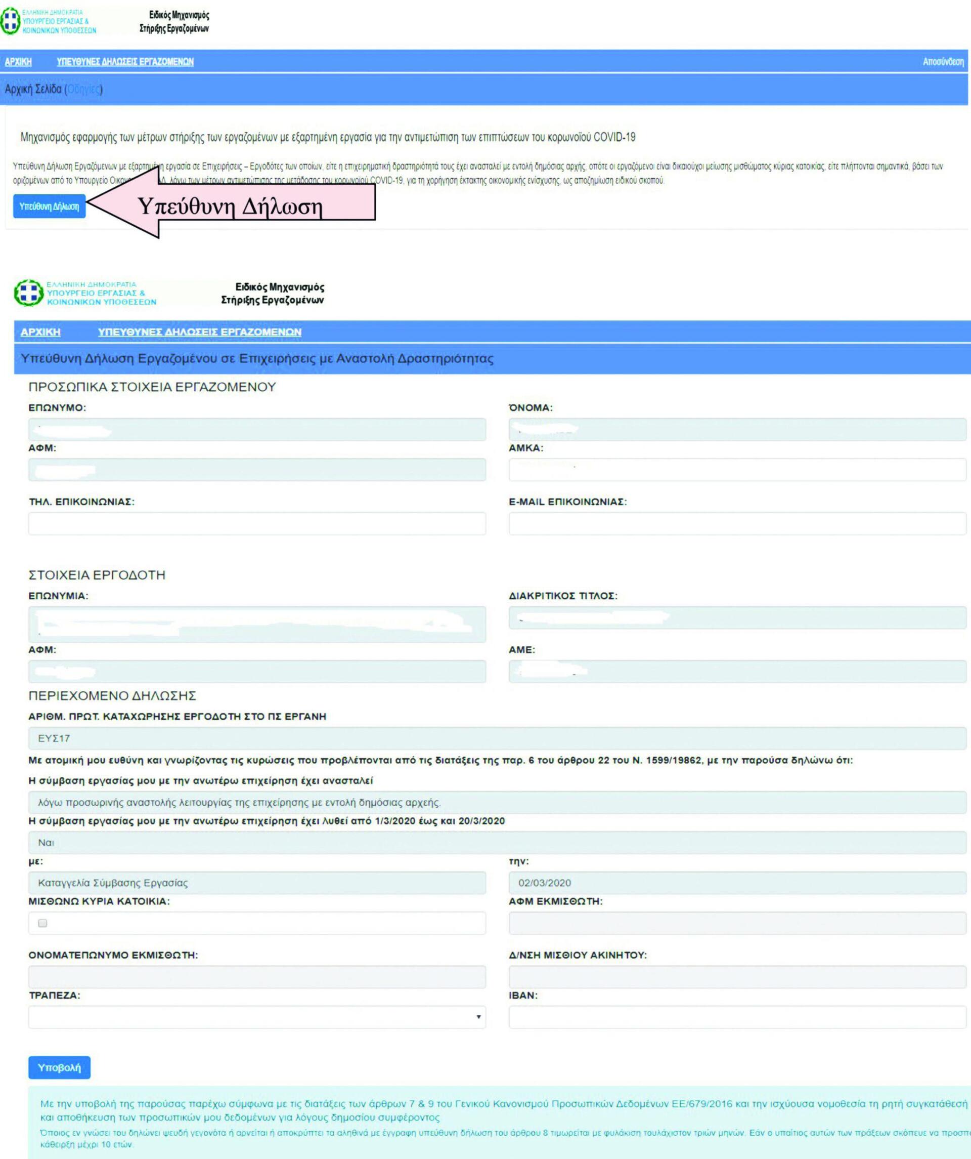 Βήμα 5ο: «Κλικ» στο κουμπί [Υπεύθυνη Δήλωση] και ο εργαζόμενος μεταβαίνει στο κύριο μενού των στοιχείων της αίτησης. Αφορά προσυμπληρωμένα στοιχεία της δήλωσης και τις προϋποθέσεις για τη χορήγηση έκτακτης οικονομικής ενίσχυσης ως αποζημίωση ειδικού σκοπού και το αίτημα του ενδιαφερομένου να υπαχθεί στον ειδικό μηχανισμό στήριξης ή στοιχεία που συμπληρώνονται από τον ενδιαφερόμενο.