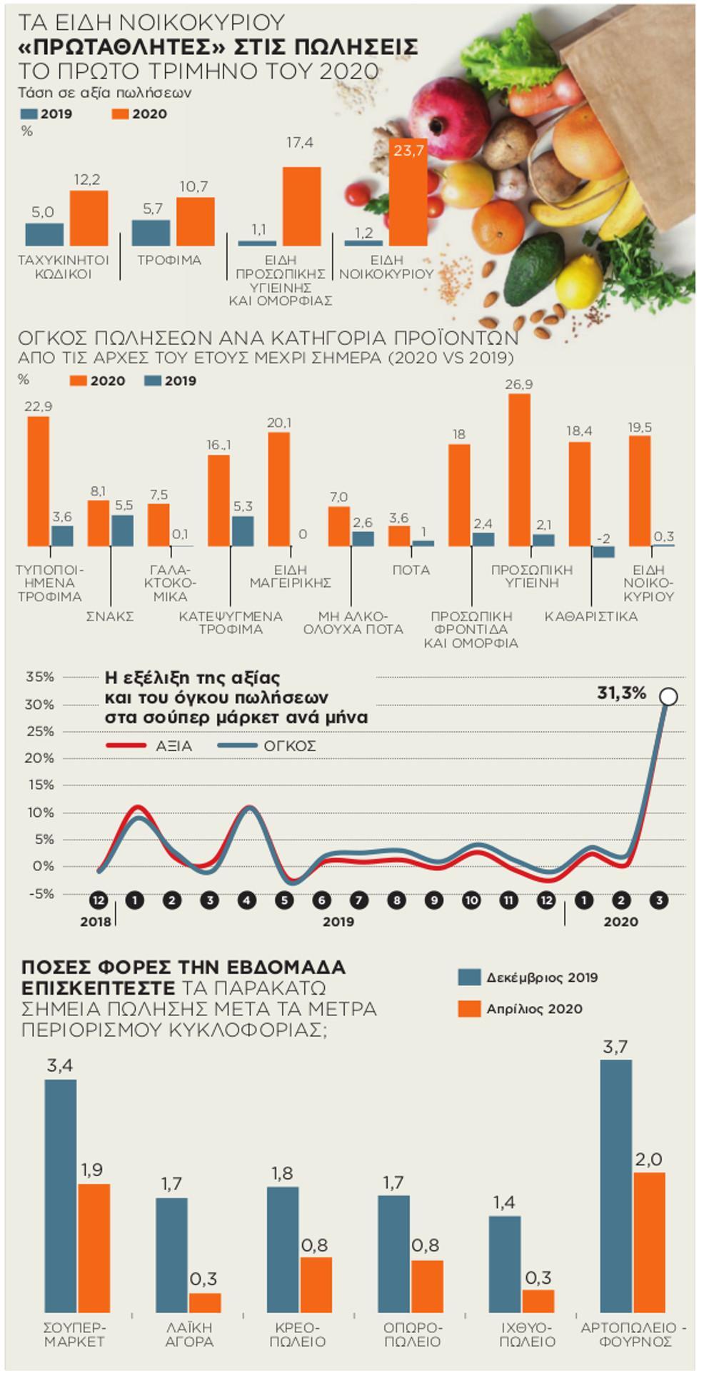Σύμφωνα με σχετική έρευνα της εταιρίας IRI, ο κύκλος εργασιών του οργανωμένου λιανεμπορίου τροφίμων και ποτών μέχρι το τέλος Μαρτίου άγγιξε τα 1,985 δισ. ευρώ, ενώ όπως ήταν αναμενόμενο «πρωταθλήτρια» κατηγορία αναδείχθηκε αυτή των προϊόντων νοικοκυριού (κυρίως τα καθαριστικά), τα οποία εμφάνισαν άνοδο σε αξία κατά 23,7%. Ακολούθησαν τα είδη προσωπικής υγιεινής με 17,4% και τα τρόφιμα με 10,7%.