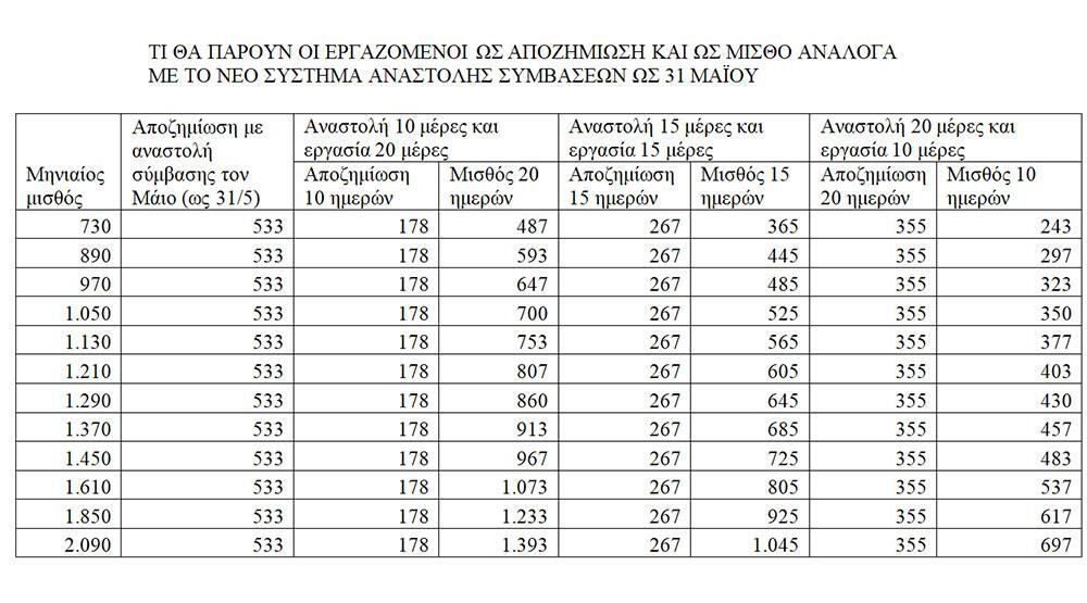 Αν ο μισθός του είναι 1.000 ευρώ, τότε για την εργασία των 10 ημερών του Μαΐου θα πάρει 333 ευρώ μισθό και για την αναστολή σύμβασης από 13 ως 20 Μαΐου θα πάρει 125 ευρώ αποζημίωση, δηλαδή 458 ευρώ για 17 μέρες από μισθό και αποζημίωση λόγω αναστολής σύμβασης.