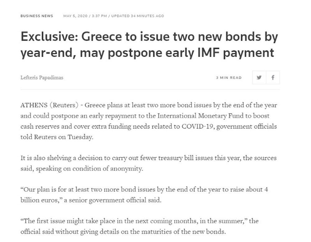 Η Ελλάδα άντλησε φέτος συνολικά 4,5 δισ. ευρώ μέσω της έκδοσης 15ετούς και 7ετούς ομολόγου. Ο αρχικός οδικός χάρτης δανεισμού προέβλεπε μειωμένες δημοπρασίες εντόκων γραμματίων κατά περίπου 5 δισ., στα 7,5 δισ. ευρώ φέτος. Παράλληλα, η Αθήνα σχεδίαζε την πρόωρη αποπληρωμή οφειλών, ύψους 1,7 δισ. ευρώ προς το ΔΝΤ που έληγαν το 2021, ένα σχέδιο που φαίνεται πως πλέον αναθεωρείται.