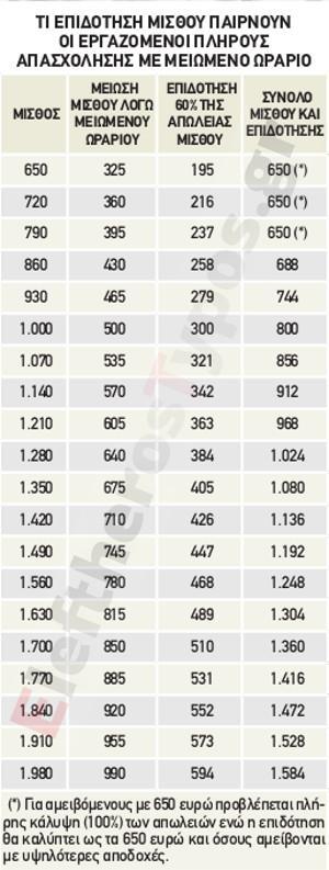 Σε περιπτώσεις που οι αμοιβές είναι πάνω από τα 650 ευρώ, η επιδότηση θα καλύπτει το 60% των μισθολογικών απωλειών με κατώφλι τα 650 ευρώ. Για παράδειγμα, εργαζόμενος πλήρους απασχόλησης με μισθό 1.100 ευρώ που θα έχει μείωση ωραρίου εργασίας για ένα μήνα, και θα πρέπει να πάρει μισό μισθό, δηλαδή 550 ευρώ, θα επιδοτηθεί κατά 60% για την απώλεια του υπόλοιπου μισθού και θα λάβει ενίσχυση 330 ευρώ (550 x 60% = 330). Ο μισθός του για τον ένα μήνα που θα εργαστεί με μειωμένο ωράριο δεν θα είναι 550 ευρώ αλλά 880 ευρώ, και λόγω της επιδότησης η απώλεια μισθού θα περιοριστεί στο 20% (880 / 1.100 = 0,20).