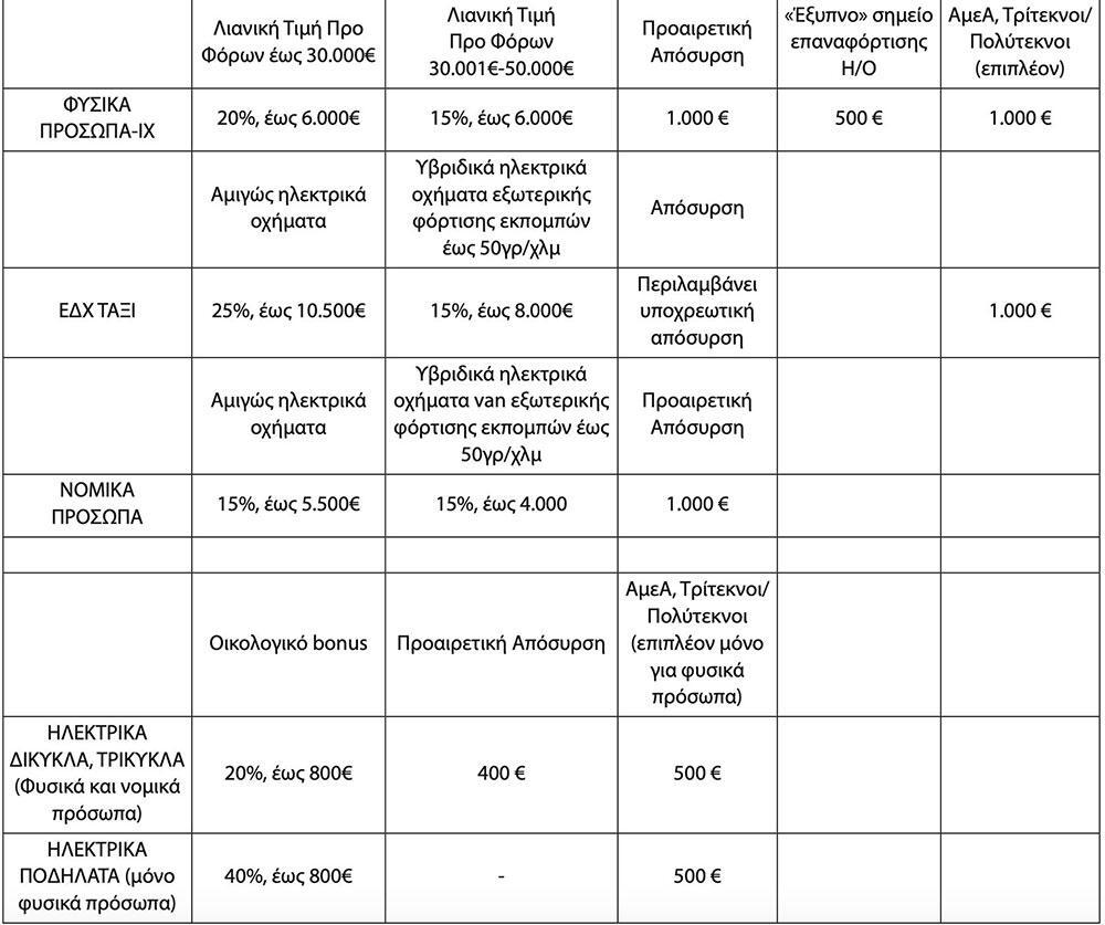 Οι επιδοτήσεις, σε ποσοστό επί της λιανικής τιμής προ φόρων ή σε απόλυτες τιμές αν πρόκειται για απόσυρση ή για αγορά φορτιστή, για όλες τις κατηγορίες οχημάτων και καταναλωτών παρουσιάζονται συνοπτικά στον συνημμένο πίνακα που περιλαμβάνεται στον Οδηγό του προγράμματος.