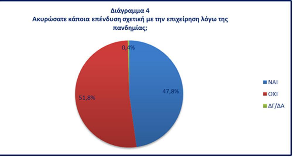 Πιο συγκεκριμένα, στο πλαίσιο της έρευνας επιχειρείται μία πρώτη αποτίμηση των επιπτώσεων της κρίσης. Από τις πιο ανησυχητικές, αφορά στον τομέα των επενδύσεων, όπου σχεδόν οι μισές επιχειρήσεις ακύρωσαν προγραμματισμένες επενδύσεις. Γεγονός, που θέτει σε κίνδυνο την προσπάθεια προσαρμογής στο νέο, γεμάτο προκλήσεις, οικονομικό και επιχειρηματικό περιβάλλον.