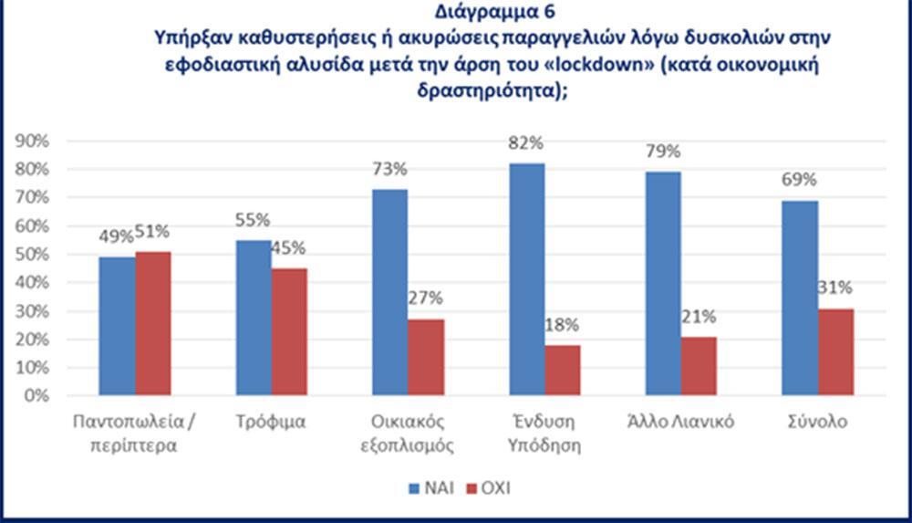 Επιπλέον, καταγράφονται σημαντικές καθυστερήσεις-ακυρώσεις στις παραγγελιών μετά την άρση του lockdown. Επτά στις δέκα επιχειρήσεις παρατήρησαν καθυστερήσεις στις παραγγελίες τους ή προχώρησαν σε ακυρώσεις εξαιτίας του δυσμενούς περιβάλλοντος που προκάλεσε η πανδημία.