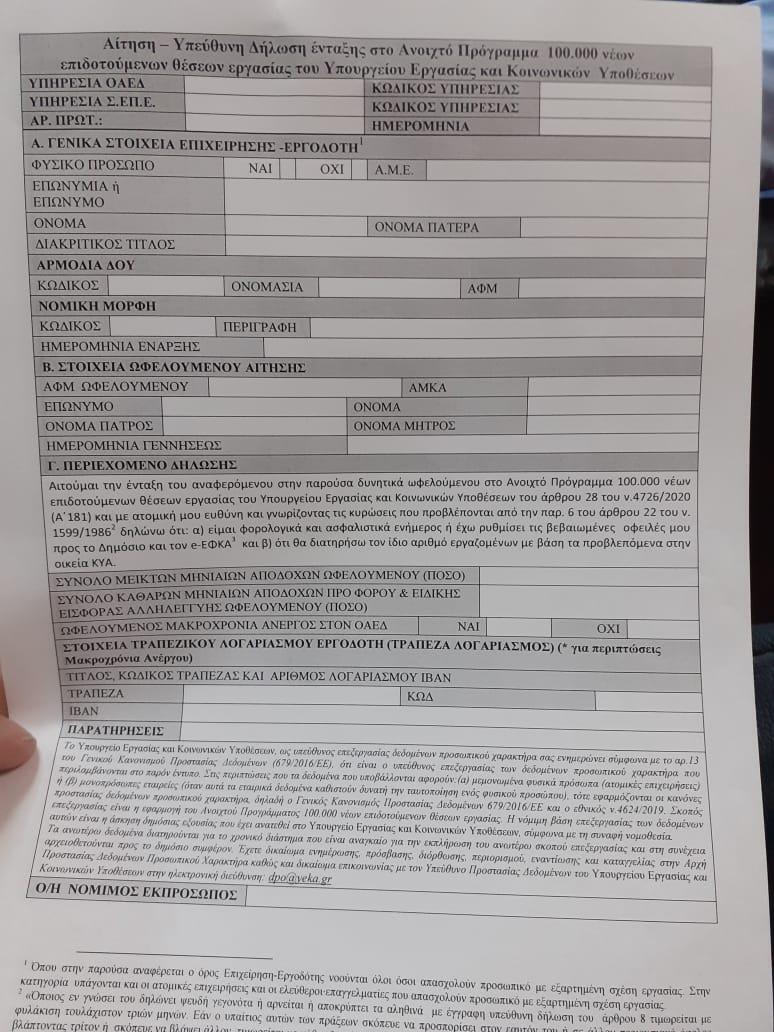 * Επισυνάπτεται η αίτηση-υπεύθυνη δήλωση ένταξης στο ανοιχτό πρόγραμμα 100.000 νέων επιδοτούμενων θέσεων εργασίας του υπουργείου Εργασίας και Κοινωνικών Υποθέσεων.