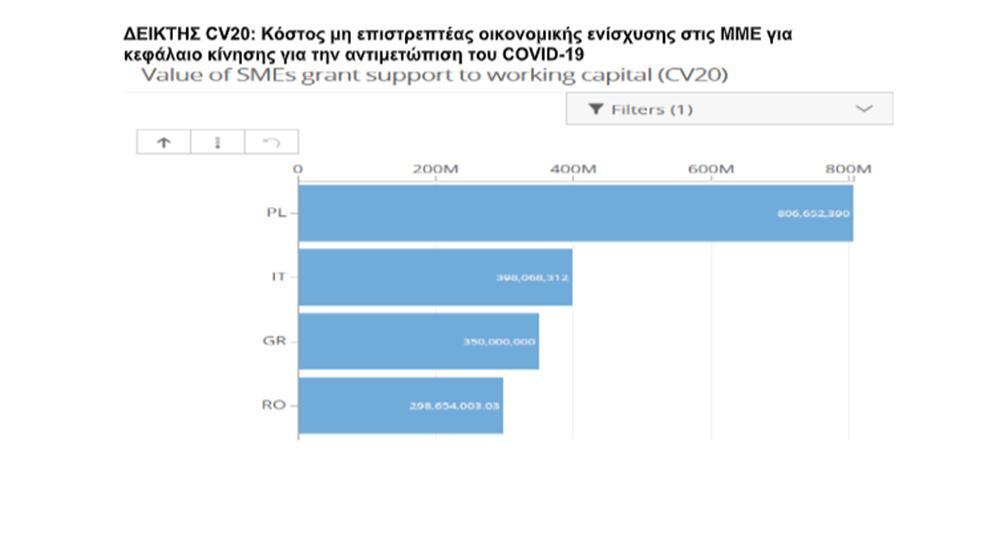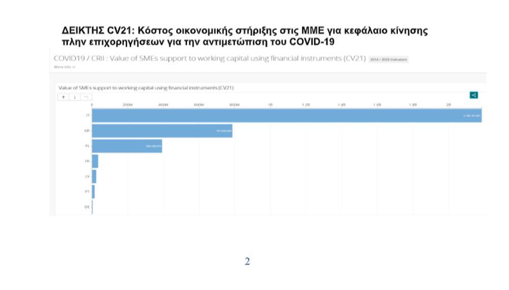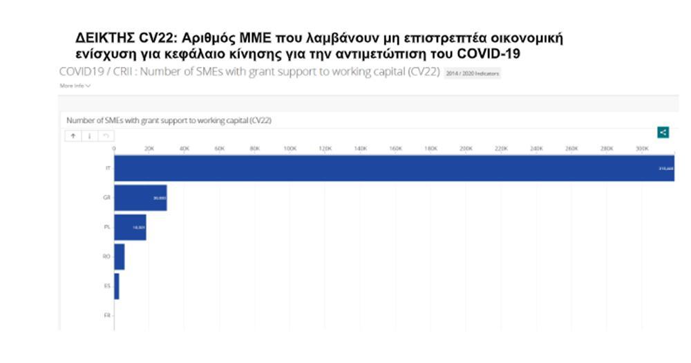 Ειδικότερα, η Ελλάδα βρίσκεται ανάμεσα στα κράτη-μέλη της Ε.Ε. με τις υψηλότερες επιδόσεις στην αξιοποίηση αυτών των πόρων για την παροχή κεφαλαίων κίνησης σε μικρές και μεσαίες επιχειρήσεις (ΜμΕ), τόσο υπό τη μορφή άμεσων επιχορηγήσεων (Δείκτης CV20), όσο και υπό τη μορφή χορήγησης δανείων κεφαλαίων κίνησης (Δείκτης CV21), καταλαμβάνοντας την 3η και 2η θέση αντίστοιχα. Ακόμη, η χώρα μας βρίσκεται στη δεύτερη θέση αναφορικά και με τον αριθμό των ΜμΕ που έλαβαν μη επιστρεπτέα κεφάλαια κίνησης, καθώς οι επιδοτούμενες επιχειρήσεις από αυτούς τους πόρους ανήλθαν στις 30.000 (Δείκτης CV22).
