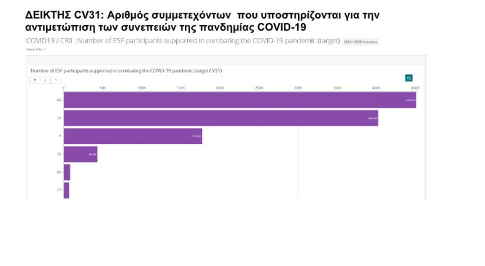 Τέλος, η χώρα μας έρχεται πρώτη σε αριθμό ωφελούμενων από δράσεις ενίσχυσης της κοινωνικής συνοχής καθώς, σε απόλυτους αριθμούς οι ωφελούμενοι ξεπέρασαν τους 450.000 (Δείκτης CV31).