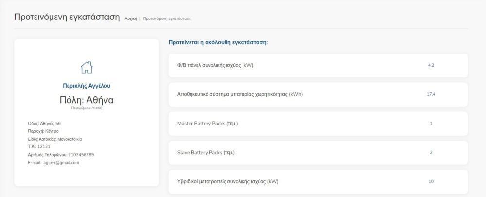 Ένας εγκαταστάτης, χρησιμοποιώντας αυτό το εργαλείο, μπορεί γρήγορα και εύκολα να έχει αποτελέσματα για μια ολοκληρωμένη λύση ενεργειακής αυτονομίας που θα προτείνει στον πελάτη του.