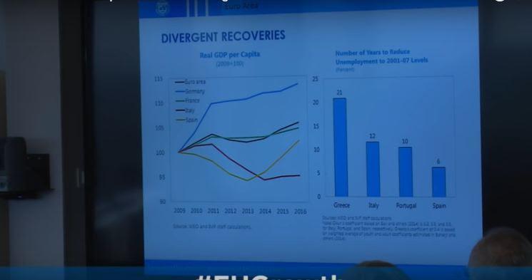 Δηλαδή το 2038 θα επιστρέψει η ανεργία στα προ κρίσης επίπεδα (7,8%), ενώ την ίδια στιγμή δήλωσε πως για την Ιταλία το ίδιο ποσοστό θα επανέλθει σε 12 χρόνια, η Πορτογαλία σε 10 και η Ισπανία σε έξι χρόνια. Όπως είπε «η διαρθρωτική ανεργία, ο αποπληθωρισμός και το υψηλό χρέος είναι κληρονομιές της οικονομικής κρίσης» και σχολίασε πως έξι χώρες της ευρωζώνης έχουν χρέος που ξεπερνά το 100% του ΑΕΠ.