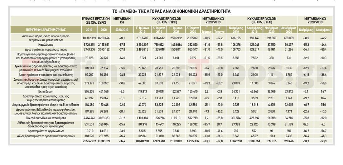 Σύμφωνα με στοιχεία που δημοσίευσε σήμερα η ΕΛ.ΣΤΑΤ., ο κύκλος εργασιών το έτος 2020 ανήλθε σε 18.789.821 χιλ. ευρώ, σημειώνοντας μείωση 36,4% σε σχέση με το έτος 2019, που είχε ανέλθει σε 29.564.997 χιλ. ευρώ, αλλά με μεγάλες διαφοροποιήσεις από τον μέσο όρο από κλάδο σε κλάδο. Τις μεγαλύτερες απώλειες είχε ο κλάδος των υπηρεσιών παροχής καταλύματος, με πτώση 67,5% το 2020 σε σύγκριση με το 2019, με δεύτερο τον κλάδο παραγωγής κινηματογραφικών ταινιών βίντεο και τηλεοπτικών προγραμμάτων, ηχογραφήσεων και μουσικών εκδόσεων, που κατέγραψε μείωση τζίρου 64%. Η πτώση τζίρου για την εστίαση λόγω των παραδόσεων φαγητού κατ’ οίκον μετριάζεται για το σύνολο του κλάδου το 2020 στο 37,5% και οι οργανώσεις συνεδρίων 25,4%.