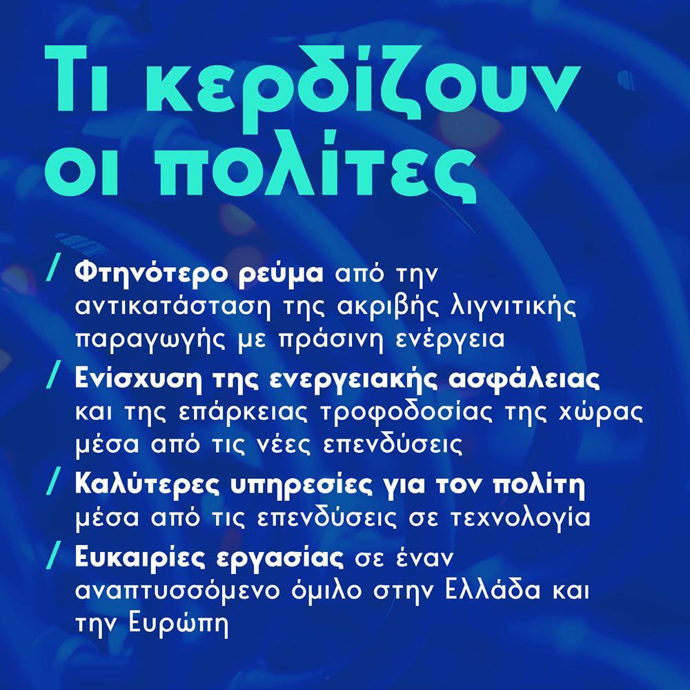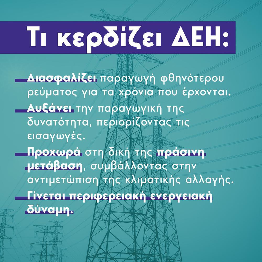 Συνεπώς, σήμερα η επιχείρηση, όχι μόνο δεν απαξιώνεται, αλλά αντιθέτως δυναμώνει και μπαίνει σε μια νέα «πράσινη» εποχή, διασφαλίζοντας την ενεργειακή ασφάλεια της χώρας, συμβάλλοντας στην αντιμετώπιση της κλιματικής αλλαγής και παράγοντας φθηνότερο ρεύμα για καταναλωτές και επιχειρήσεις.