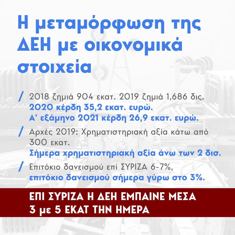 Δύο χρόνια μετά την αλλαγή κυβέρνησης και διοίκησης, η ΔΕΗ έχει αναγεννηθεί. Η επιχείρηση από ζημιές 900 εκατ. το 2018 και 1,6 δισ. το 2019, πέρασε σε κερδοφορία 32,5 εκατ. το 2020 και αναμένεται να κλείσει με κερδοφορία και το 2021. Η κεφαλαιακή αξία της ΔΕΗ, που επί ΣΥΡΙΖΑ ήταν κάτω από 300 εκατ., σήμερα έχει φτάσει πάνω από 2 δισ.. Η περιουσία του ελληνικού λαού, δηλαδή, αυξήθηκε μέσα σε δύο μόλις χρόνια κατά 1,5 με 2 2 δισ..