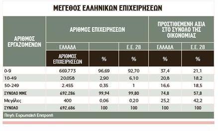 Βάσει Ευρωπαϊκής Επιτροπής, οι ΜμΕ συνιστούν την πλειονότητα της επιχειρηματικής δραστηριότητας στη χώρα μας. Αρκεί να αναλογιστεί κανείς πως σε σύνολο 692.686 επιχειρήσεων μόνο οι 400 είναι μεγάλες (πίνακας). Στοιχεία από την Ελληνική Στατιστική Αρχή (ΕΛ.ΣΤΑΤ.) αποτυπώνουν, με σαφήνεια, το σοκ που έχουν υποστεί οι μικρομεσαίοι τα τελευταία χρόνια. Ενδεικτικά σημειώνεται πως οι θέσεις εργασίας στις ΜμΕ μειώθηκαν από 2,2 εκατ. το 2010 σε 1,85 εκατ. το 2015. Μάλιστα, το 67% της ανεργίας που δημιουργήθηκε στην Ελλάδα είναι αποτέλεσμα της ύφεσης στις ΜμΕ.
