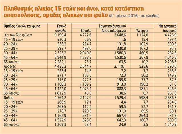 1. Οι απασχολούμενοι στην ηλικιακή ομάδα 45-64 ετών ανήλθαν στο δ’ τρίμηνο του 2016 στο 1,53 εκατ. σε σύνολο 3,648 εκατ. αντιπροσωπεύοντας μερίδιο 42%. Το αντίστοιχο ποσοστό στο δ’ τρίμηνο του 2001 (δηλαδή λίγο πριν από την είσοδο της χώρας στο ευρώ) ήταν 33%. Τότε, οι απασχολούμενοι έφταναν στα 4,152 εκατ. και οι έχοντες συμπληρώσει το 45ο έτος της ηλικίας τους ήταν 1,447 εκατομμύρια.