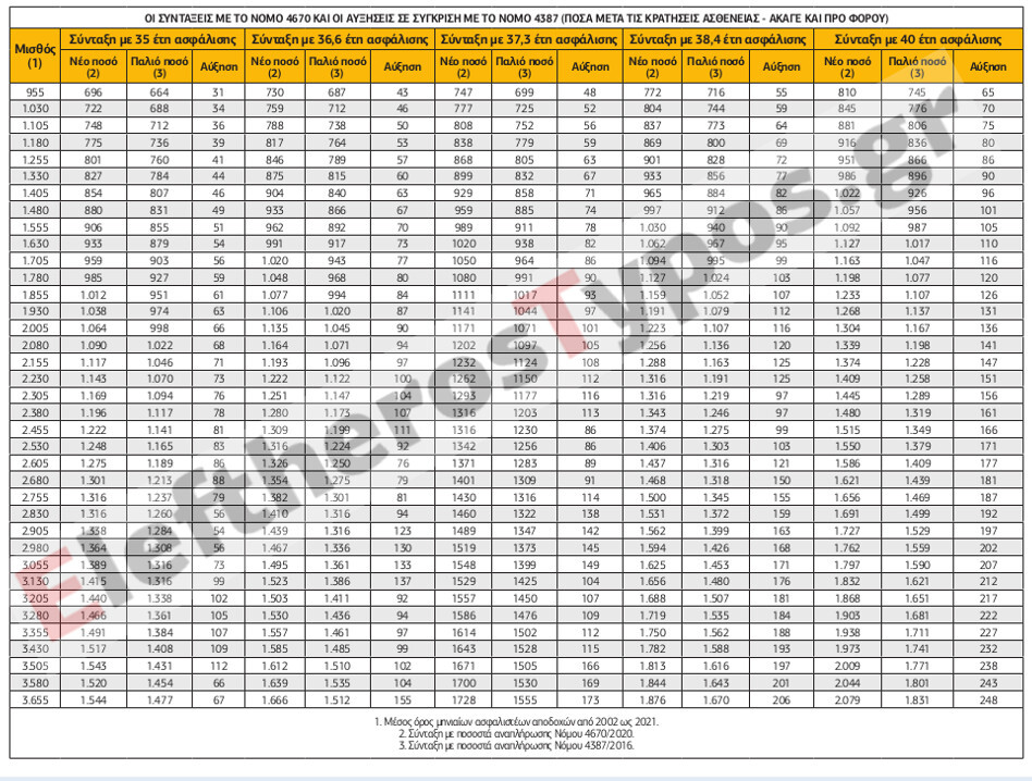 Σύμφωνα με τον πίνακα, οι νέες συντάξεις και οι αυξήσεις σε σύγκριση με τις παλιές διαμορφώνονται ως εξής: