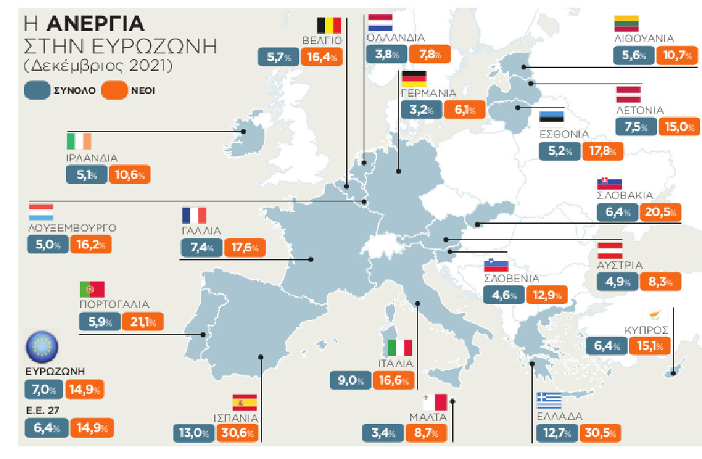 Για την Ελλάδα η Κομισιόν προβλέπει ποσοστό ανεργίας 15,0% το 2022 και 14,5% το 2023, ωστόσο η χώρα μας κινείται ήδη σε χαμηλότερα επίπεδα από τις παραπάνω προβλέψεις.