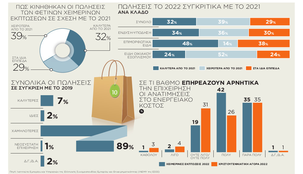 Ειδικότερα για τις πωλήσεις την περίοδο των χειμερινών εκπτώσεων, από την ετήσια έρευνα σε πανελλαδικό δείγμα επιχειρήσεων που πραγματοποίησε το Ινστιτούτο Εμπορίου και Υπηρεσιών της Ελληνικής Συνομοσπονδίας Εμπορίου και Επιχειρηματικότητας (ΙΝΕΜΥ της ΕΣΕE) προκύπτουν τα εξής βασικά συμπεράσματα: