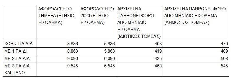 Για έναν φορολογούμενο με δύο παιδιά, το αφορολόγητο θα πέσει στα 6.090 ευρώ και θα αρχίσει να πληρώνει φόρο από το μηνιαίο εισόδημα των 435 ευρώ εάν εργάζεται στον ιδιωτικό τομέα (εισπράττει 14 μισθούς το χρόνο) ή από τα 508 ευρώ το μήνα εάν εργάζεται στο Δημόσιο (εισπράττει 12 μισθούς).
