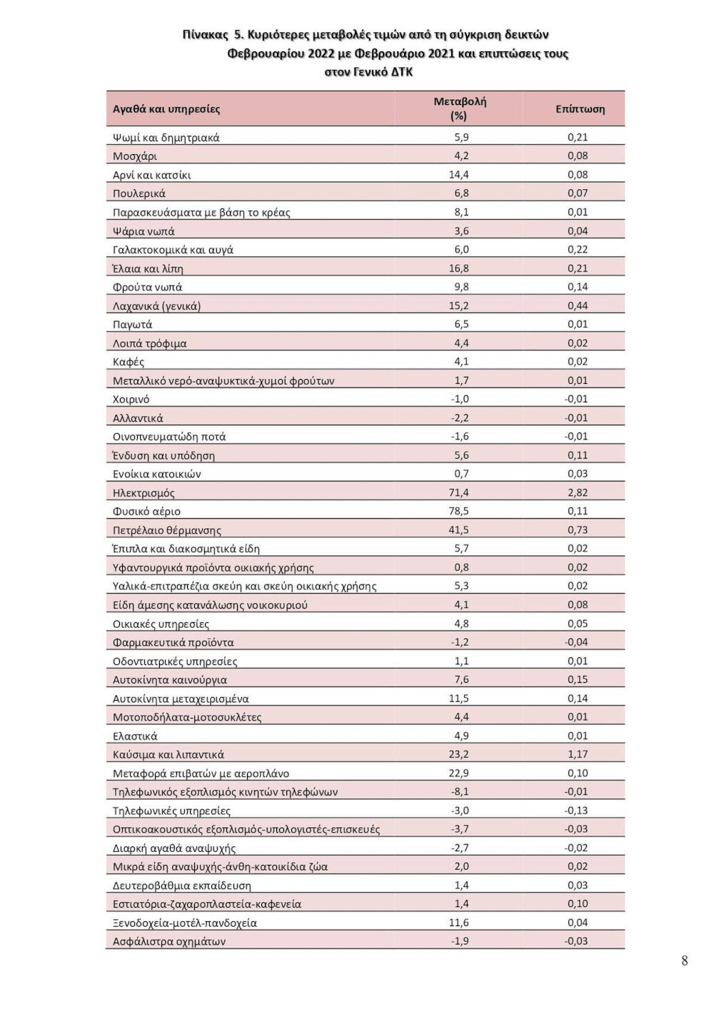 Σύμφωνα με την ΕΛΣΤΑΤ, η αύξηση του γενικού δείκτη τιμών καταναλωτή κατά 7,2% τον Φεβρουάριο προήλθε κυρίως από τις μεταβολές στις ακόλουθες ομάδες αγαθών και υπηρεσιών:
