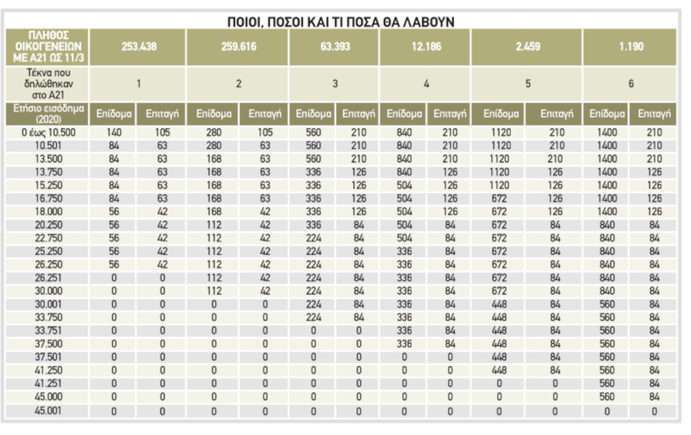 * Οικογένεια με 3 παιδιά και με ετήσιο εισόδημα 18.000 ευρώ θα πληρωθεί 336 ευρώ επίδομα και 126 ευρώ επιταγή ακρίβειας.