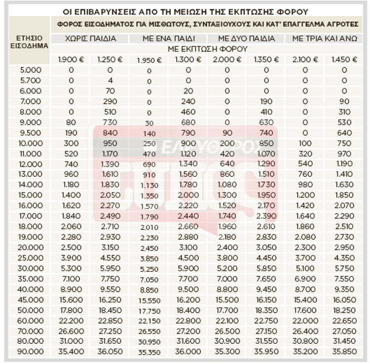1 Η σημερινή έκπτωση φόρου των 1.900 ευρώ για τους μισθωτούς, τους συνταξιούχους και τους κατ’ επάγγελμα αγρότες που δεν βαρύνονται με ανήλικα ή ενήλικα εξαρτώμενα τέκνα (σπουδάζοντα, άνεργα κ.λπ.) θα μειωθεί στα 1.250 ευρώ. Η μείωση της έκπτωσης φόρου κατά 650 ευρώ με δεδομένο ότι θα συνδυαστεί με διατήρηση του κατώτατου συντελεστή φορολόγησης στο 22% θα οδηγήσει σε μείωση του ισχύοντος για τους φορολογούμενους αυτούς αφορολόγητου ορίου από τις 8.636 ευρώ (1.900 ευρώ/22%) στις 5.681 ευρώ (1.250 ευρώ/22%).