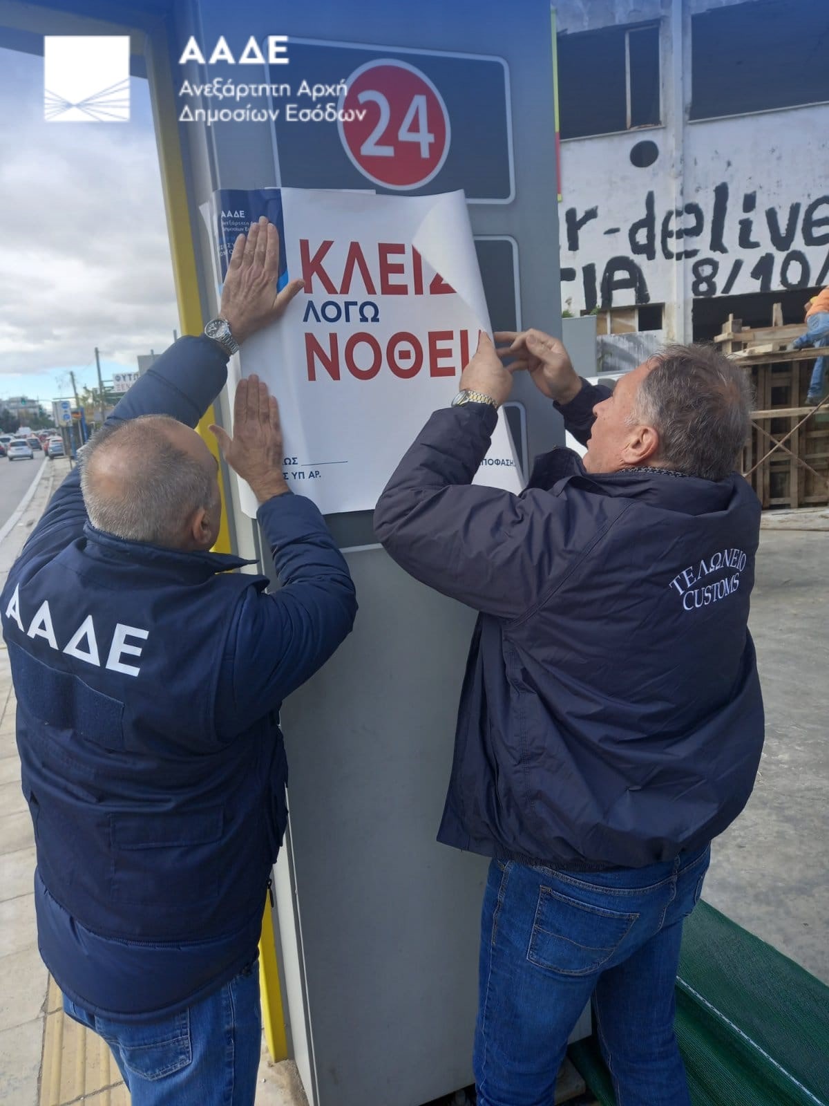 Οι ελεγκτές, μαζί με ένοπλους αστυνομικούς, σφράγισαν το πρατήριο για δύο χρόνια και προχωρούν στην επιβολή των προβλεπόμενων προστίμων.