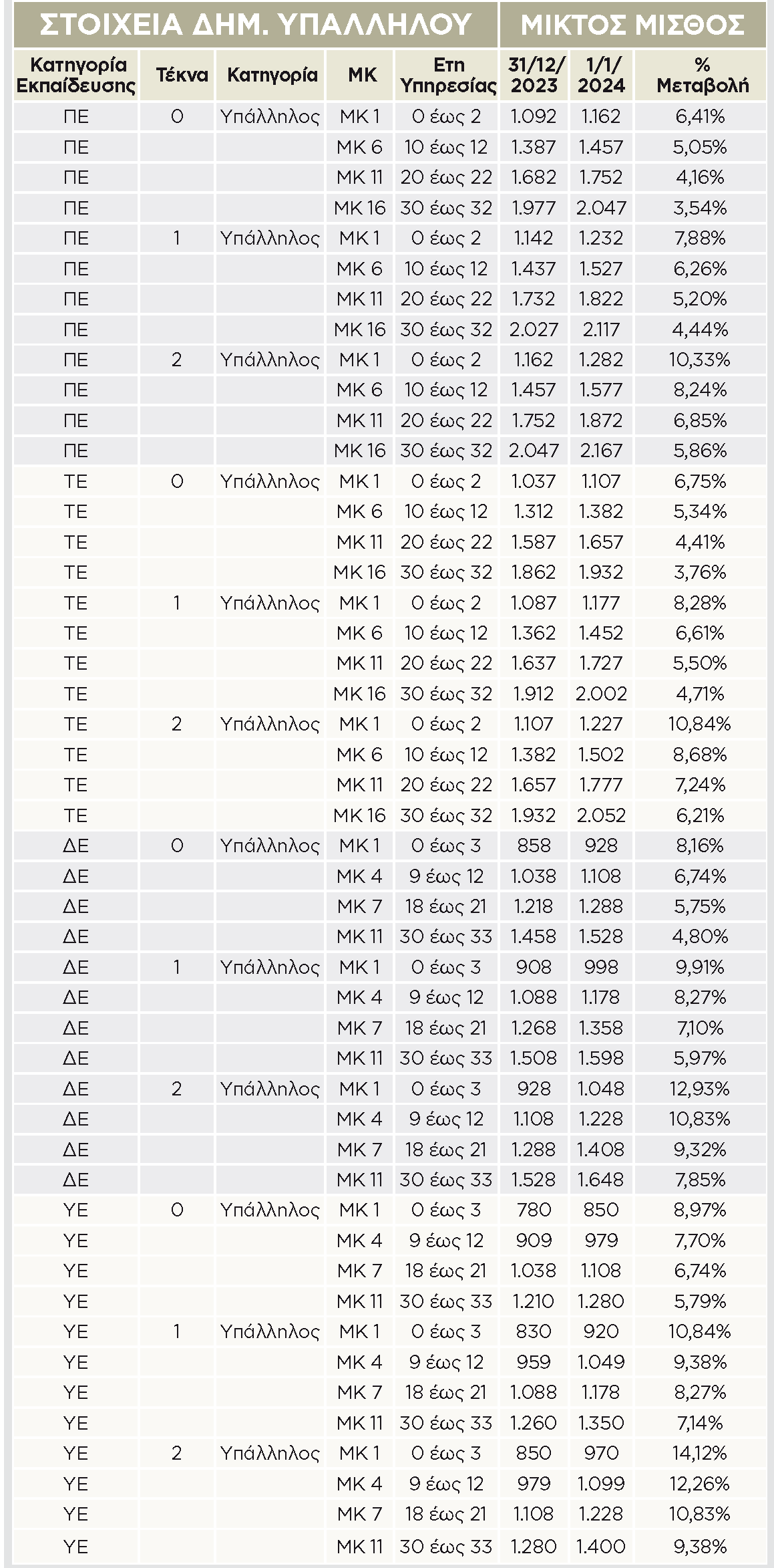| ΠΟΣΟ ΑΥΞΑΝΟΝΤΑΙ ΑΠΟ ΤΗΝ 1η/1/2024 ΟΙ ΒΑΣΙΚΟΙ ΜΙΣΘΟΙ ΤΩΝ ΠΟΛΙΤΙΚΩΝ ΔΗΜΟΣΙΩΝ ΥΠΑΛΛΗΛΩΝ | |||||||
