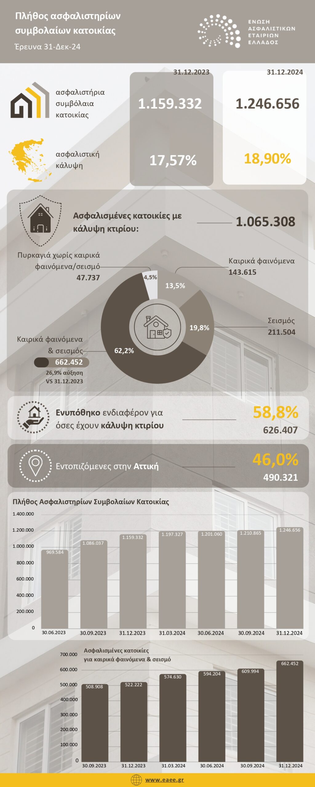 Το συνολικό πλήθος των ασφαλισμένων κατοικιών ανήλθε σε 1.246.656 συμβόλαια στις 31 Δεκεμβρίου 2024, σημειώνοντας αύξηση 7,5% σε σχέση με το 2023. Από τα ασφαλισμένα ακίνητα, 662.452 περιλαμβάνουν κάλυψη τόσο για καιρικά φαινόμενα όσο και για σεισμό, καταγράφοντας άνοδο 26,9% συγκριτικά με το προηγούμενο έτος.