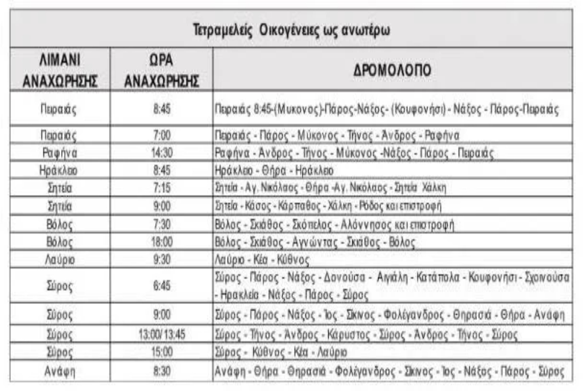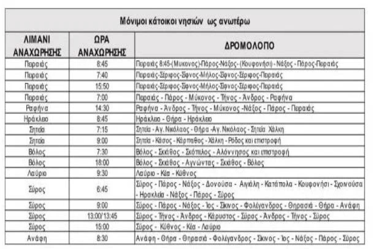20% έκπτωση στα εισιτήρια επιβάτη σε όλα τα νησιά του Αιγαίου στα δρομολόγια όπως αναφέρονται στον παρακάτω πίνακα. (Για τους μόνιμους κατοίκους Δωδεκανήσων έκπτωση 40% στη γραμμή Σητεία – Δωδεκάνησα).