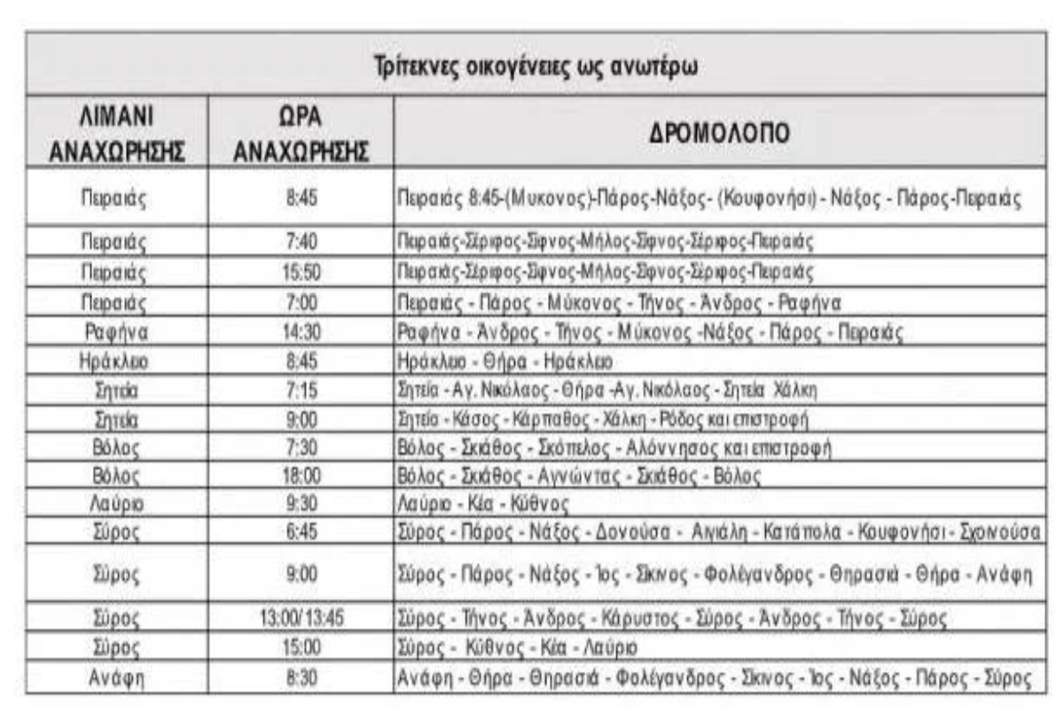 30% έκπτωση στα εισιτήρια επιστροφής επιβάτη για τους τρίτεκνους με την ταυτόχρονη έκδοση εισιτηρίων μετ’ επιστροφής στα δρομολόγια όπως αναφέρονται στον παρακάτω πίνακα. (Για τους πολύτεκνους ισχύει ήδη η έκπτωση 50%).