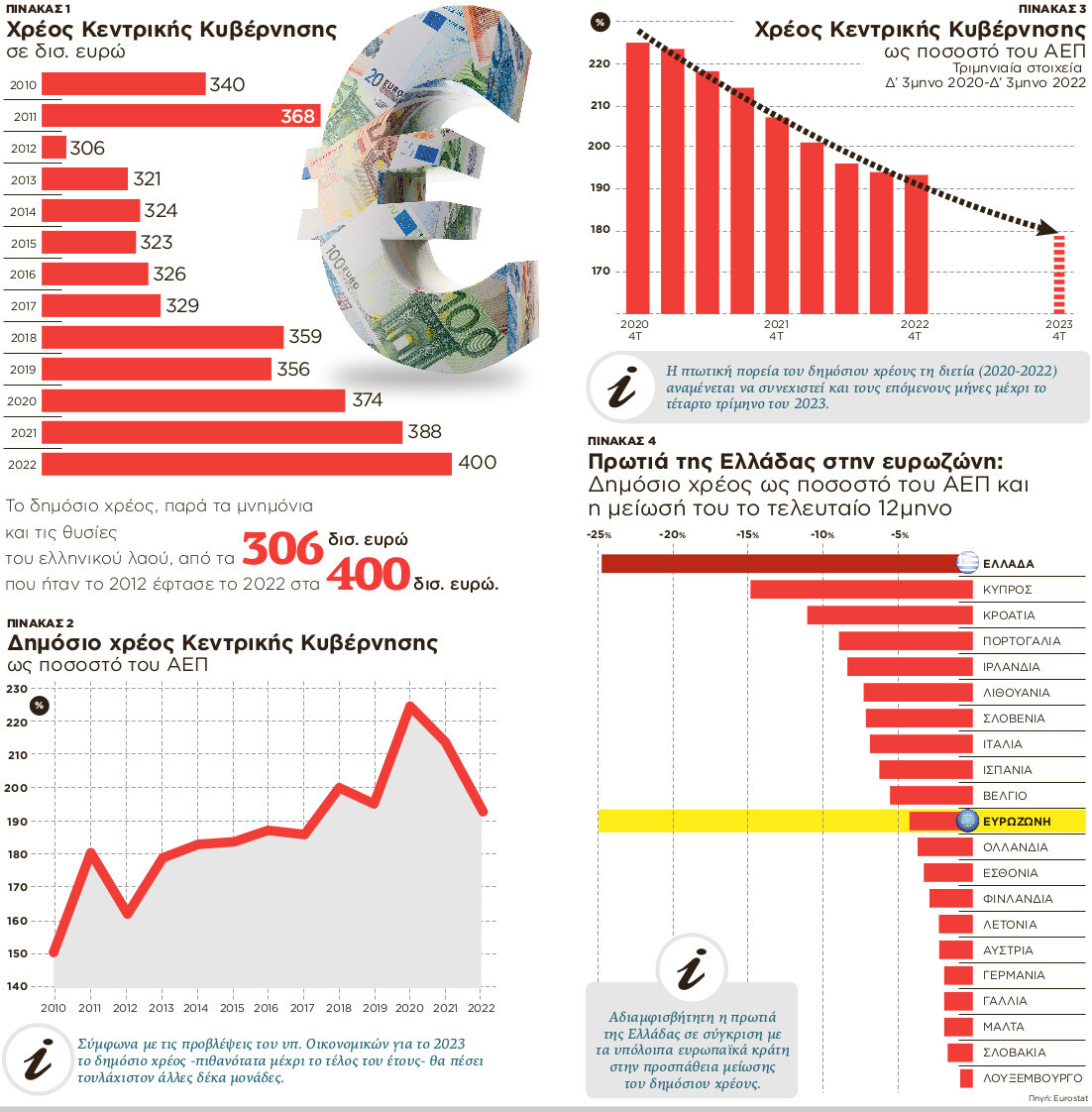 Το πόσα χρήματα χρωστάμε εξαρτάται από πόσα εισοδήματα δημιουργούνται κάθε χρόνο από τα οποία αντλούνται οι φόροι και αποπληρώνεται σταδιακά το χρέος. Επομένως το ουσιαστικότερο μέγεθος είναι το χρέος ως ποσοστό της εθνικής παραγωγής και όχι το απόλυτο ύψος του δημόσιου χρέους. Ο λόγος χρέους προς ΑΕΠ ανέβηκε από το 162% το 2012 στο 225% το 2020 (πίνακας 2). Στη συνέχεια βλέπουμε μια ραγδαία μείωση που στις 31/12/2022 έφερε το χρέος στο 193% του ΑΕΠ. Εφόσον ευοδωθούν οι προβλέψεις του υπουργείου Οικονομικών για το 2023 πιθανότατα μέχρι το τέλος του έτους το χρέος θα πέσει τουλάχιστον άλλες δέκα μονάδες.