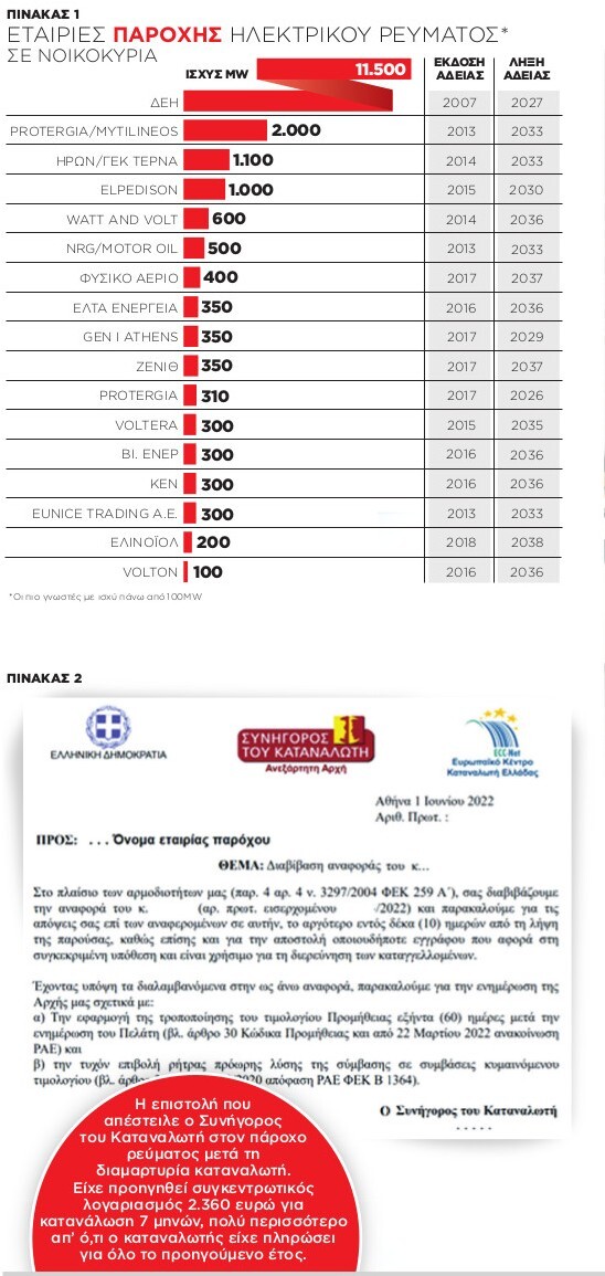 Σήμερα το μεγάλο θέμα είναι η ρήτρα αναπροσαρμογής που έχει κάνει το τιμολόγιο του ηλεκτρικού ρεύματος χαράτσι διαρκείας. Το πιο τραγελαφικό είναι ότι όσοι είχαν προνοήσει να υπογράψουν συμβόλαιο με σταθερή τιμή ρεύματος, κάτι που γίνεται εφόσον συμφωνήσει ο καταναλωτής να πληρώνει την κιλοβατώρα σε υψηλότερη τιμή, είδαν μαζική ακύρωση του συμβολαίου τους μονομερώς από τους διάφορους παρόχους ρεύματος που δραστηριοποιούνται στην αγορά. Εδώ να σημειώσουμε ότι όταν εφαρμόστηκε στην Ελλάδα η οδηγία της Ε.Ε. που απελευθέρωνε την τιμή της ηλεκτρικής ενέργειας, πλήθος προμηθευτών ηλεκτρικού ρεύματος είχαν ήδη εγκατεστημένη ισχύ παραγωγής από το 2013 και μετά, πέραν της γνωστής σε όλους ΔΕΗ (βλέπε πίνακας 1).