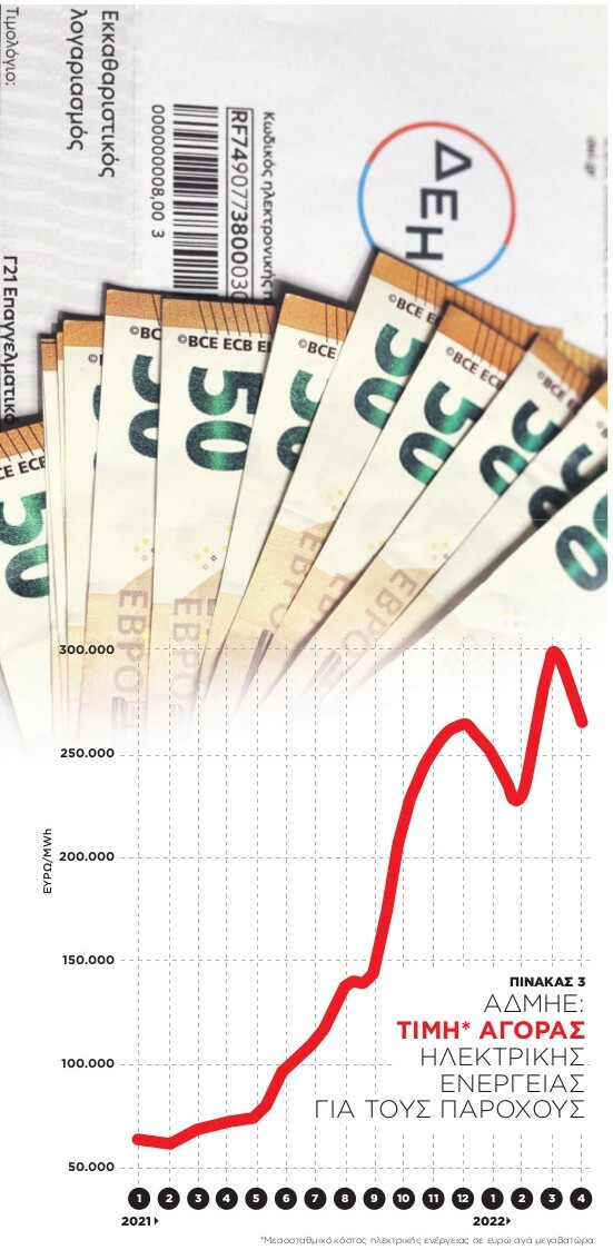 Από τη μεριά των παρόχων ηλεκτρικής ενέργειας είναι κατανοητό ότι τους βαραίνει ένα μεγάλο κόστος τους τελευταίους μήνες. Ολα πλέον διαμορφώνονται μέσω χρηματιστηριακών τιμών όπου το κάθε καύσιμο υπόκειται στους νόμους της προσφοράς και της ζήτησης. Σήμερα έχουμε μείωση των προσφερόμενων μορφών ενέργειας που χρησιμοποιούνται για να παραχθεί ο ηλεκτρισμός και άρα αύξηση των τιμών του. Η αλήθεια είναι ότι η Ε.Ε. συνολικά έχει παγιδευτεί στις υψηλές τιμές του φυσικού αερίου που ωθούν προς τα πάνω και τις τιμές του παραγόμενου ηλεκτρικού ρεύματος. Η απεικόνιση της κατάστασης που αντιμετωπίζουν οι πάροχοι στην Ελλάδα φαίνεται από τα στοιχεία κόστους που δημοσιοποιεί ο ΑΔΜΗΕ και παραθέτουμε στον πίνακα 3.