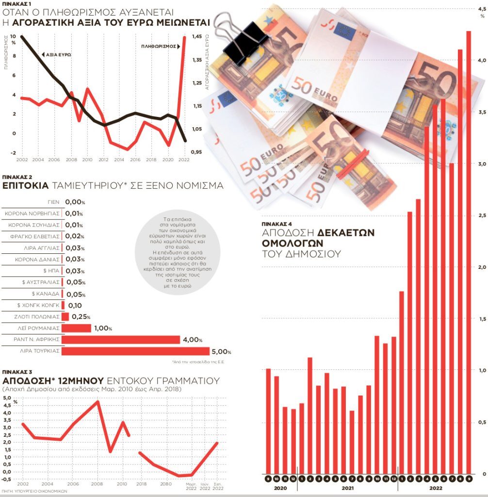 Υπάρχουν ωστόσο ευκαιρίες. Αν κάποιος είχε κλείσει τις αποταμιεύσεις του σε δολάρια ΗΠΑ για ένα χρόνο, αν και ο ετήσιος τόκος στο δολάριο είναι μηδαμινός, η ισχυροποίηση του δολαρίου σε σχέση με το ευρώ (δηλαδή η ανατίμησή του) έχει ως αποτέλεσμα μια απόδοση πάνω από 15%. Εντυπωσιακό κέρδος, αλλά ποιος θα μπορούσε πέρσι τέτοια εποχή να είχε προβλέψει τον πόλεμο στην Ουκρανία και το άλμα στις τιμές ενέργειας, που έκανε το νόμισμα των ΗΠΑ ένα από τα πλέον ζητούμενα στη συναλλαγματική αγορά σήμερα; Το να έχεις τις αποταμιεύσεις σου σε ένα καλάθι νομισμάτων είναι μια συνετή στρατηγική, αλλά πρέπει να υπάρχει προσοχή στις επιλογές και στην ποικιλία των νομισμάτων γιατί όσα περισσότερα νομίσματα εισέρχονται στο «πορτοφόλι» τόσο αυξάνεται το ρίσκο, οι απώλειες λόγω υποτίμησης με τα κέρδη από ανατίμηση να συμψηφίζονται, οδηγώντας σε μηδενικό αποτέλεσμα. Μια γεύση του τι επιτόκια ισχύουν ανά νόμισμα, στον πίνακα 2. Είναι εμφανές ότι ανάλογα με το πόσο εύρωστη είναι η οικονομία κάθε κράτους ισχύει και διαφορετικό επιτόκιο. Στην περίπτωση της ασθενικής τουρκικής οικονομίας το επιτόκιο είναι το μεγαλύτερο στη λίστα του πίνακα. Αν κάποιος είχε επενδύσει σε λίρες Τουρκίας προ έτους €1.000 που ισοδυναμούσαν σε 10.000 λίρες, τότε μαζί με τον τόκο το συνολικό κεφάλαιο θα ήταν σήμερα 10.500 λίρες. Η πτώση όμως της λίρας κατά την ίδια περίοδο ήταν τόσο μεγάλη ώστε το ποσό των λιρών εκφρασμένο σε ευρώ σήμερα μειώνεται στα €573, γεγονός που δείχνει τεράστια ζημιά. Συμπέρασμα, σημαντικές ζημιές μπορεί να προκύψουν όταν κάποιος αποφασίζει να επενδύσει ή να δανειστεί σε ξένα νομίσματα λαμβάνοντας υπόψη μόνο το ύψος του επιτοκίου. Τέτοιες ζημιές είναι ήδη γνωστές σε όσους δανείστηκαν τα τελευταία χρόνια σε ελβετικά φράγκα λόγω του χαμηλού επιτοκίου που ισχύει σε αυτό το νόμισμα, αλλά εκ των υστέρων είδαν ότι η ανατίμηση του φράγκου τούς έκαψε.